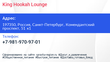 King Hookah Lounge по адресу 197350, Россия, Санкт-Петербург, Комендантский проспект, 51 к1 в дальнейшем Организация, размещена в следующих категориях: