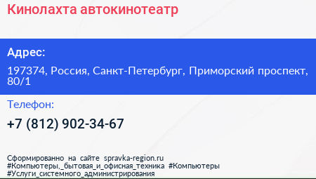 Кинолахта, автокинотеатр по адресу 197374, Россия, Санкт-Петербург, Приморский проспект, 80/1 в дальнейшем Организация, размещена в следующих категориях: