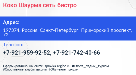 Коко Шаурма, сеть бистро по адресу 197374, Россия, Санкт-Петербург, Приморский проспект, 72 в дальнейшем Организация, размещена в следующих категориях: