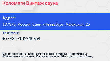 Коломяги-Винтаж, сауна по адресу 197375, Россия, Санкт-Петербург, Афонская, 25 в дальнейшем Организация, размещена в следующих категориях: