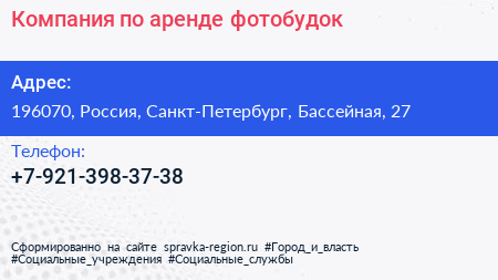 Компания по аренде фотобудок по адресу 196070, Россия, Санкт-Петербург, Бассейная, 27 в дальнейшем Организация, размещена в следующих категориях: