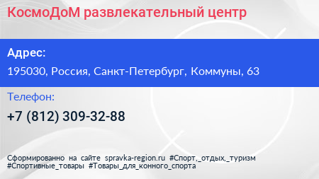 КосмоДоМ, развлекательный центр по адресу 195030, Россия, Санкт-Петербург, Коммуны, 63 в дальнейшем Организация, размещена в следующих категориях: