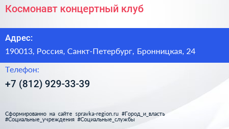 Космонавт, концертный клуб по адресу 190013, Россия, Санкт-Петербург, Бронницкая, 24 в дальнейшем Организация, размещена в следующих категориях: