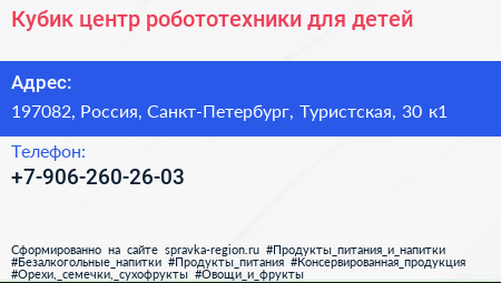 Кубик, центр робототехники для детей по адресу 197082, Россия, Санкт-Петербург, Туристская, 30 к1 в дальнейшем Организация, размещена в следующих категориях: