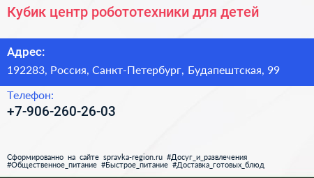 Кубик, центр робототехники для детей по адресу 192283, Россия, Санкт-Петербург, Будапештская, 99 в дальнейшем Организация, размещена в следующих категориях: