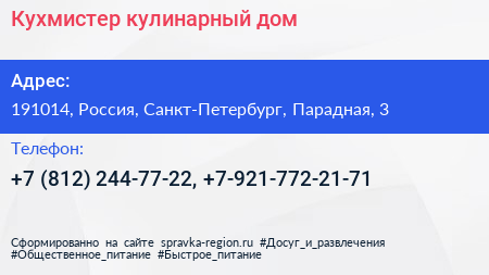 Кухмистер, кулинарный дом по адресу 191014, Россия, Санкт-Петербург, Парадная, 3 в дальнейшем Организация, размещена в следующих категориях: