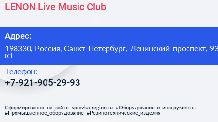 LENON Live Music Club по адресу 198330, Россия, Санкт-Петербург, Ленинский проспект, 93 к1 в дальнейшем Организация, размещена в следующих категориях: