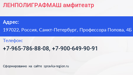 ЛЕНПОЛИГРАФМАШ, амфитеатр по адресу 197022, Россия, Санкт-Петербург, Профессора Попова, 4Б в дальнейшем Организация, размещена в следующих категориях: