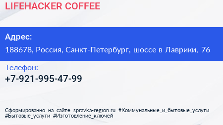 LIFEHACKER COFFEE по адресу 188678, Россия, Санкт-Петербург, шоссе в Лаврики, 76 в дальнейшем Организация, размещена в следующих категориях: