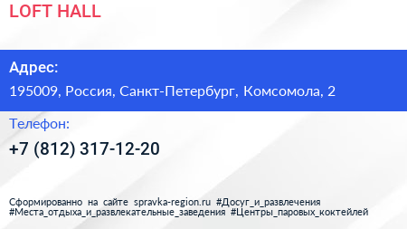 LOFT HALL по адресу 195009, Россия, Санкт-Петербург, Комсомола, 2 в дальнейшем Организация, размещена в следующих категориях: