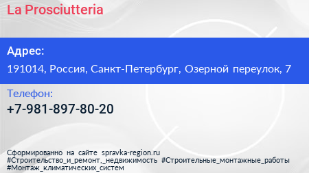 La Prosciutteria по адресу 191014, Россия, Санкт-Петербург, Озерной переулок, 7 в дальнейшем Организация, размещена в следующих категориях: