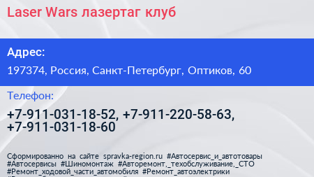 Laser Wars, лазертаг-клуб по адресу 197374, Россия, Санкт-Петербург, Оптиков, 60 в дальнейшем Организация, размещена в следующих категориях: