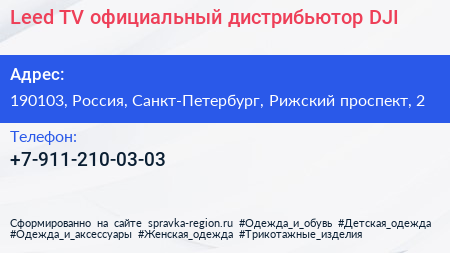 Leed.TV, официальный дистрибьютор DJI по адресу 190103, Россия, Санкт-Петербург, Рижский проспект, 2 в дальнейшем Организация, размещена в следующих категориях: