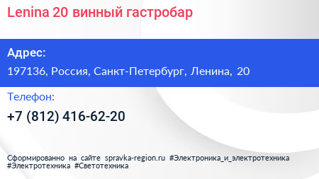 Lenina.20, винный гастробар по адресу 197136, Россия, Санкт-Петербург, Ленина, 20 в дальнейшем Организация, размещена в следующих категориях: