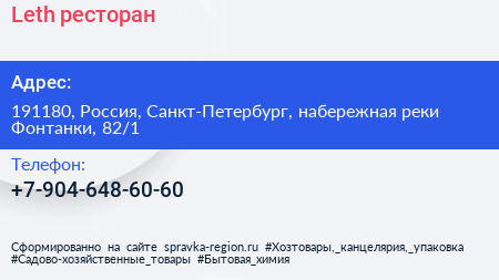 Leth, ресторан по адресу 191180, Россия, Санкт-Петербург, набережная реки Фонтанки, 82/1 в дальнейшем Организация, размещена в следующих категориях: