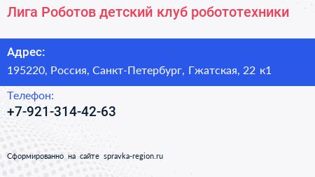 Лига Роботов, детский клуб робототехники по адресу 195220, Россия, Санкт-Петербург, Гжатская, 22 к1 в дальнейшем Организация, размещена в следующих категориях:
