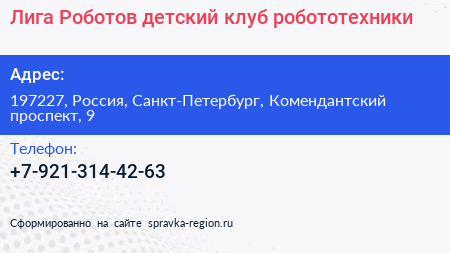 Лига Роботов, детский клуб робототехники по адресу 197227, Россия, Санкт-Петербург, Комендантский проспект, 9 в дальнейшем Организация, размещена в следующих категориях: