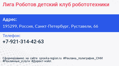 Лига Роботов, детский клуб робототехники по адресу 195299, Россия, Санкт-Петербург, Руставели, 66 в дальнейшем Организация, размещена в следующих категориях: