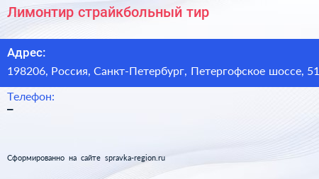 Лимонтир, страйкбольный тир по адресу 198206, Россия, Санкт-Петербург, Петергофское шоссе, 51 в дальнейшем Организация, размещена в следующих категориях: