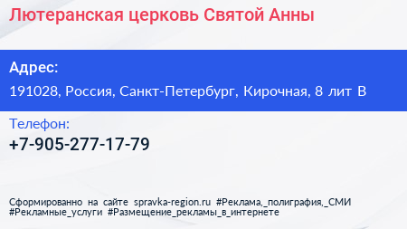Лютеранская церковь Святой Анны по адресу 191028, Россия, Санкт-Петербург, Кирочная, 8 лит В в дальнейшем Организация, размещена в следующих категориях: