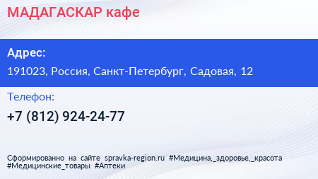 МАДАГАСКАР, кафе по адресу 191023, Россия, Санкт-Петербург, Садовая, 12 в дальнейшем Организация, размещена в следующих категориях: