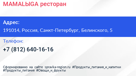 МАМАLЫGA, ресторан по адресу 191014, Россия, Санкт-Петербург, Белинского, 5 в дальнейшем Организация, размещена в следующих категориях:
