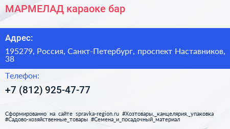 МАРМЕЛАД, караоке-бар по адресу 195279, Россия, Санкт-Петербург, проспект Наставников, 38 в дальнейшем Организация, размещена в следующих категориях: