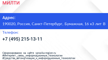 МИЛТИ по адресу 190020, Россия, Санкт-Петербург, Бумажная, 16 к3 лит В в дальнейшем Организация, размещена в следующих категориях: