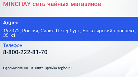 MINCHAY, сеть чайных магазинов по адресу 197372, Россия, Санкт-Петербург, Богатырский проспект, 35 к1 в дальнейшем Организация, размещена в следующих категориях: