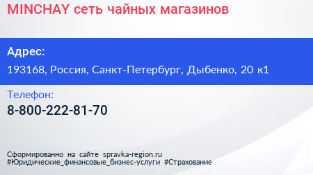 MINCHAY, сеть чайных магазинов по адресу 193168, Россия, Санкт-Петербург, Дыбенко, 20 к1 в дальнейшем Организация, размещена в следующих категориях: