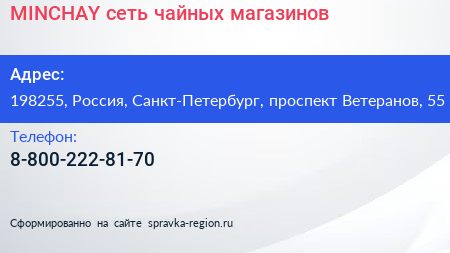 MINCHAY, сеть чайных магазинов по адресу 198255, Россия, Санкт-Петербург, проспект Ветеранов, 55 в дальнейшем Организация, размещена в следующих категориях: