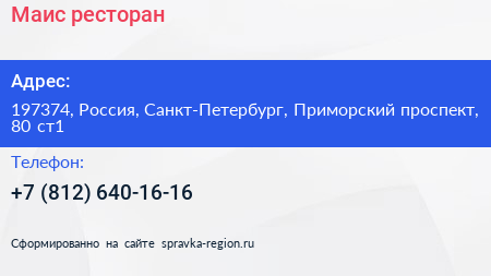 Маис, ресторан по адресу 197374, Россия, Санкт-Петербург, Приморский проспект, 80 ст1 в дальнейшем Организация, размещена в следующих категориях: