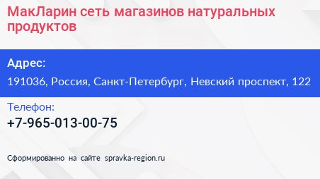 МакЛарин, сеть магазинов натуральных продуктов по адресу 191036, Россия, Санкт-Петербург, Невский проспект, 122 в дальнейшем Организация, размещена в следующих категориях: