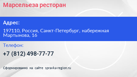Марсельеза, ресторан по адресу 197110, Россия, Санкт-Петербург, набережная Мартынова, 16 в дальнейшем Организация, размещена в следующих категориях: