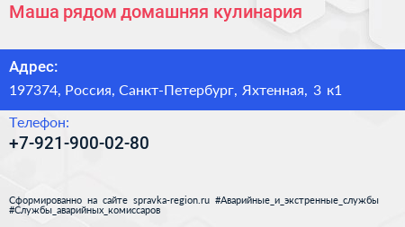 Маша рядом, домашняя кулинария по адресу 197374, Россия, Санкт-Петербург, Яхтенная, 3 к1 в дальнейшем Организация, размещена в следующих категориях: