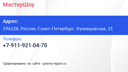 МастерШоу по адресу 196128, Россия, Санкт-Петербург, Кузнецовская, 21 в дальнейшем Организация, размещена в следующих категориях: