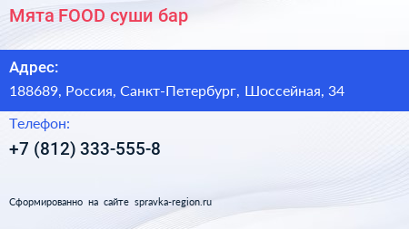 Мята FOOD, суши-бар по адресу 188689, Россия, Санкт-Петербург, Шоссейная, 34 в дальнейшем Организация, размещена в следующих категориях: