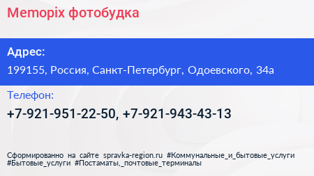 Memopix, фотобудка по адресу 199155, Россия, Санкт-Петербург, Одоевского, 34а в дальнейшем Организация, размещена в следующих категориях: