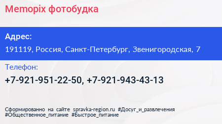 Memopix, фотобудка по адресу 191119, Россия, Санкт-Петербург, Звенигородская, 7 в дальнейшем Организация, размещена в следующих категориях: