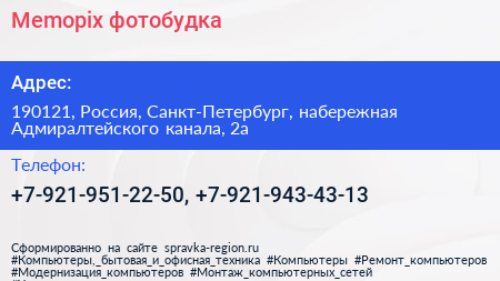 Memopix, фотобудка по адресу 190121, Россия, Санкт-Петербург, набережная Адмиралтейского канала, 2а в дальнейшем Организация, размещена в следующих категориях: