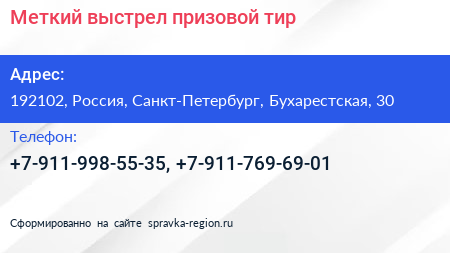 Меткий выстрел, призовой тир по адресу 192102, Россия, Санкт-Петербург, Бухарестская, 30 в дальнейшем Организация, размещена в следующих категориях: