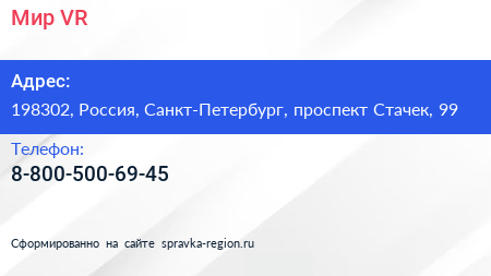 Мир VR по адресу 198302, Россия, Санкт-Петербург, проспект Стачек, 99 в дальнейшем Организация, размещена в следующих категориях: