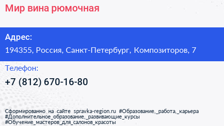 Мир вина, рюмочная по адресу 194355, Россия, Санкт-Петербург, Композиторов, 7 в дальнейшем Организация, размещена в следующих категориях: