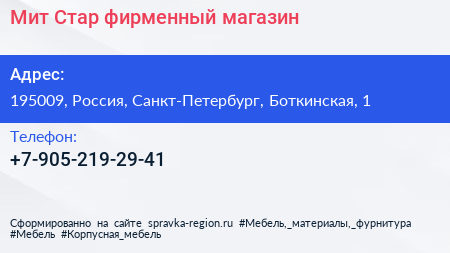 Мит Стар, фирменный магазин по адресу 195009, Россия, Санкт-Петербург, Боткинская, 1 в дальнейшем Организация, размещена в следующих категориях: