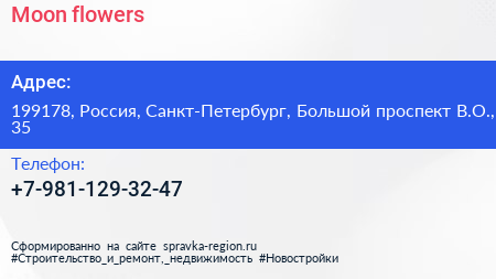 Moon flowers по адресу 199178, Россия, Санкт-Петербург, Большой проспект В.О., 35 в дальнейшем Организация, размещена в следующих категориях: