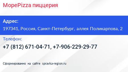 МореPizza, пиццерия по адресу 197341, Россия, Санкт-Петербург, аллея Поликарпова, 2 в дальнейшем Организация, размещена в следующих категориях:
