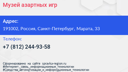 Музей азартных игр по адресу 191002, Россия, Санкт-Петербург, Марата, 33 в дальнейшем Организация, размещена в следующих категориях: