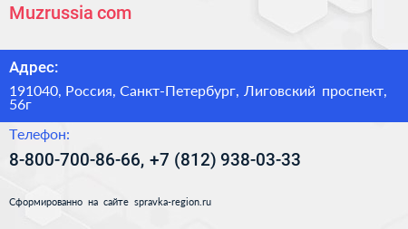Muzrussia.com по адресу 191040, Россия, Санкт-Петербург, Лиговский проспект, 56г в дальнейшем Организация, размещена в следующих категориях: