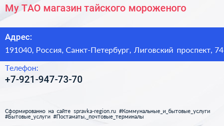My TAO, магазин тайского мороженого по адресу 191040, Россия, Санкт-Петербург, Лиговский проспект, 74 в дальнейшем Организация, размещена в следующих категориях: