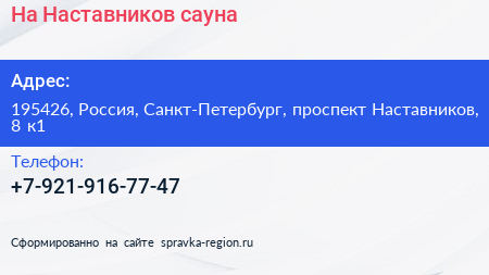 На Наставников, сауна по адресу 195426, Россия, Санкт-Петербург, проспект Наставников, 8 к1 в дальнейшем Организация, размещена в следующих категориях: